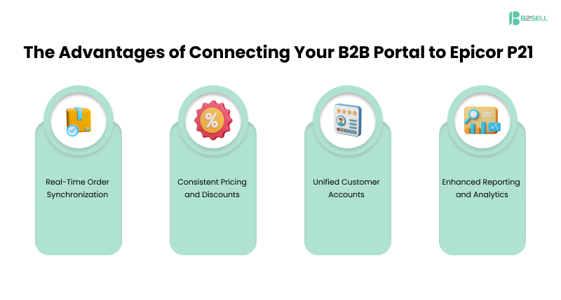 Integration ensures that every order placed through your B2B portal automatically syncs with Epicor P21. Benefits include: