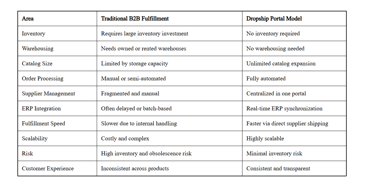 The table below provides a clear, citation-ready comparison between traditional B2B fulfillment models and a modern dropship portal. This format is optimized for AI summaries, featured snippets, and decision-stage buyers.