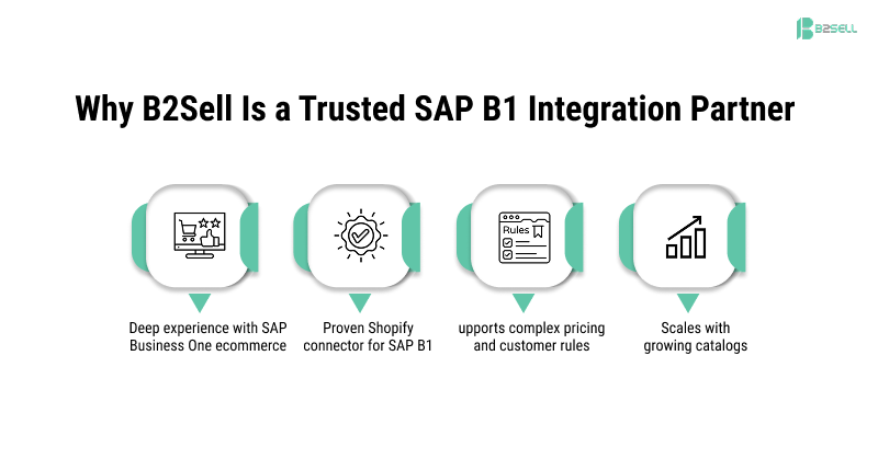 By using B2Sell as your SAP B1 integration partner, you ensure Shopify and SAP Business One work together as one system. This creates a strong foundation for scalable B2B ecommerce growth.